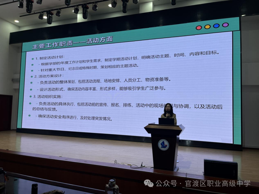 活动部策划与执行:董颖老师为活动部工作推进领航定向。董颖老师要求,在活动统筹上,精心筹备技能节、文艺汇演、运动会等校园盛事,同时组织技能竞赛等职业特色活动,各环节精准打磨,学生们需分组协作,保障活动有序精彩,同学们踊跃组队参与。