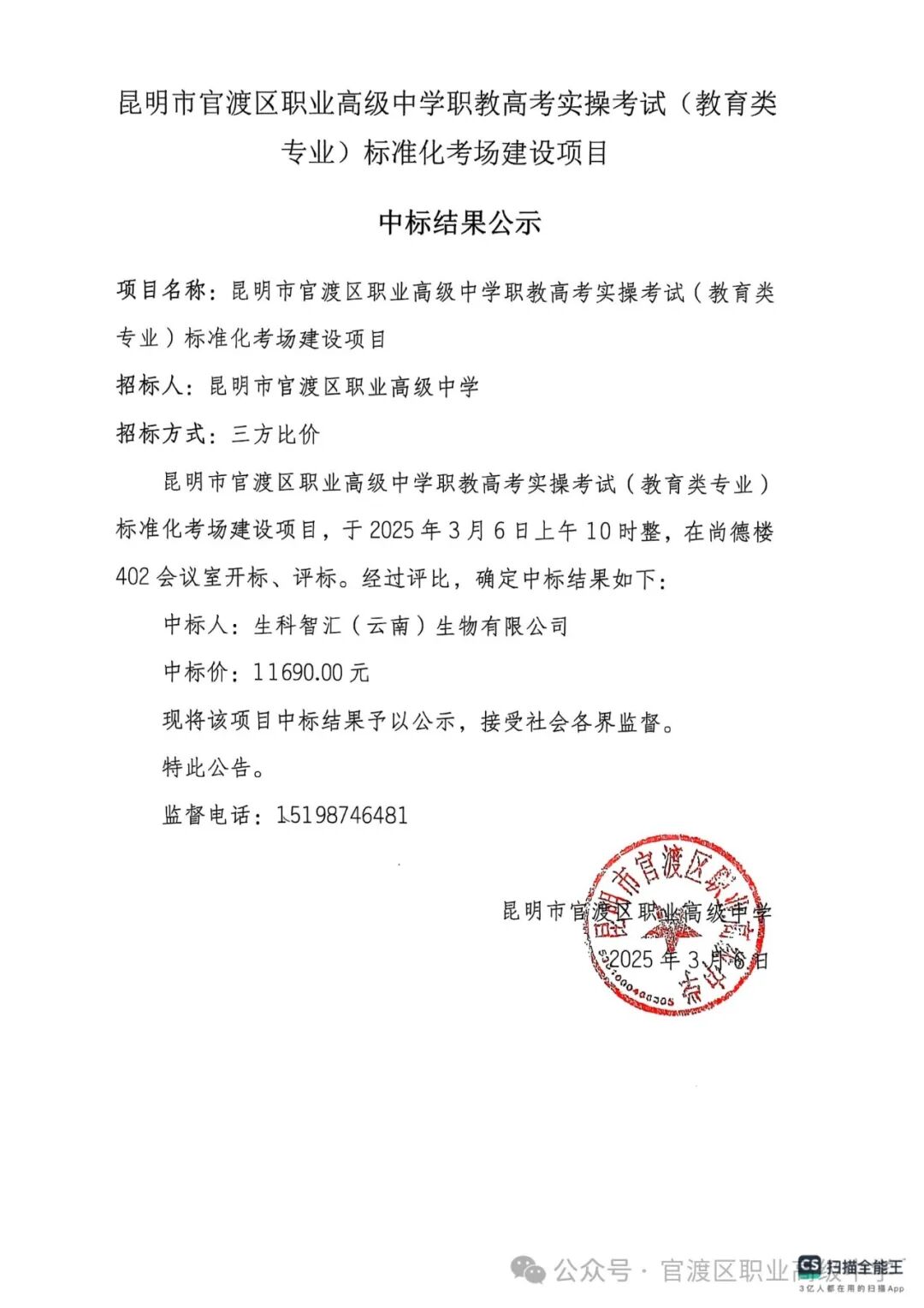 昆明市官渡区职业高级中学职教高考实操考试(教育类专业)标准化考场建设项目中标结果公示