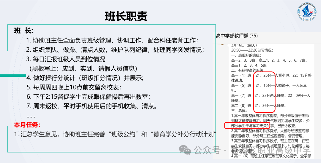 为进一步提升学生干部队伍的思想意识、综合能力与实践水平,发挥模范带头作用,推动学部班级管理,综合高中学部于2025年3月17日20:50在任之厅召开了学生干部大会。本次会议由德育干事戴艳谷老师主讲,各班班委、全体宿舍长、高一自管会同学参与本次会议。会议围绕班干部角色定位、素质要求、职责分工、近期任务及个人发展等内容展开,为班干部们指明了工作方向。