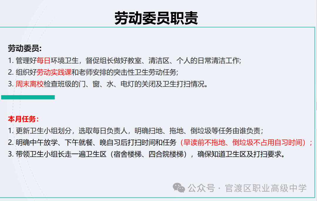 随后,戴老师对班长、学习委员、纪律委员、心理委员、文体委员等岗位职责进行细化,并部署近期重点工作。她强调,班委团队要打破职务界限,建立“分工不分家”的合作机制,定期召开班委例会,协同解决问题。