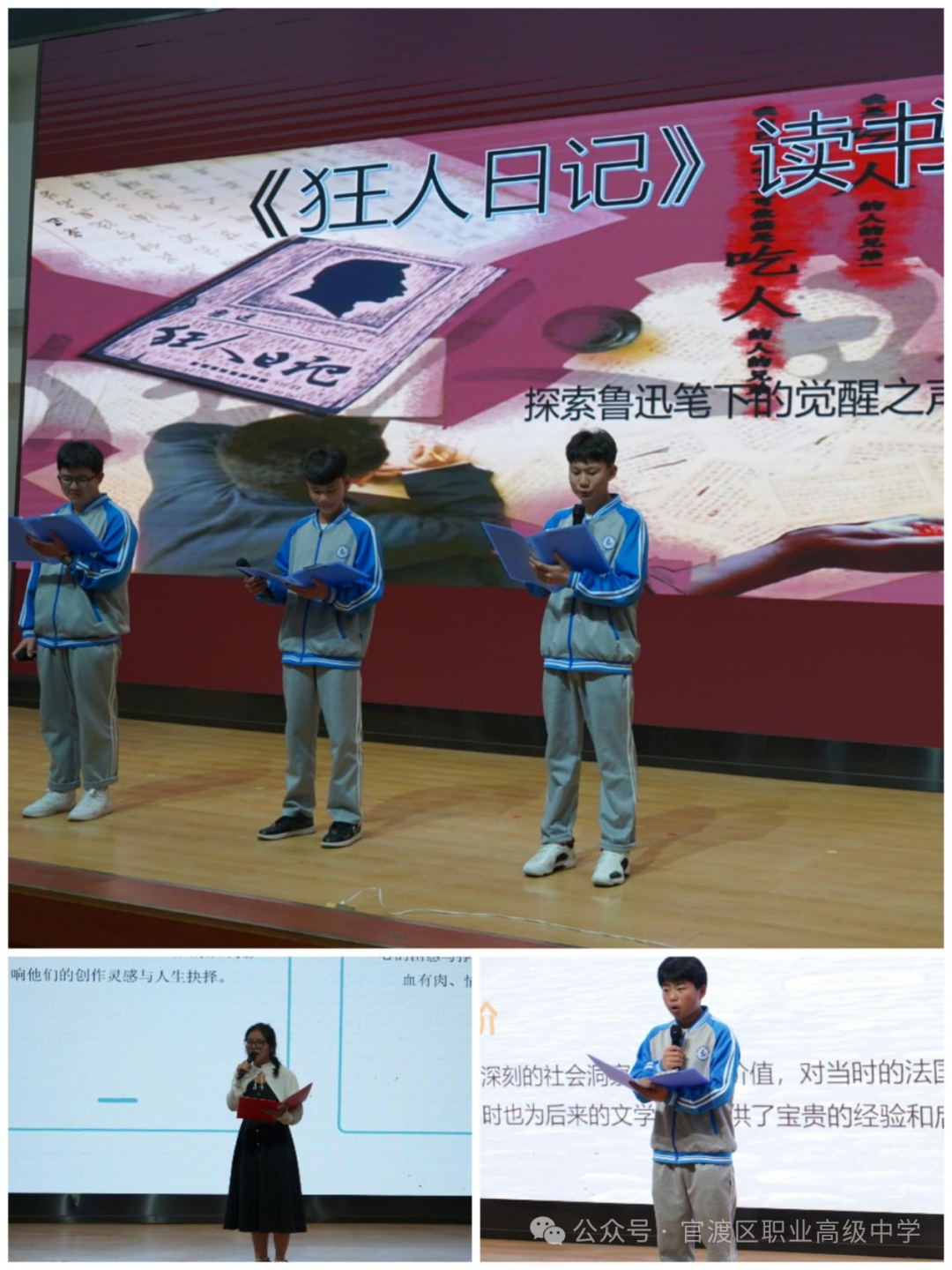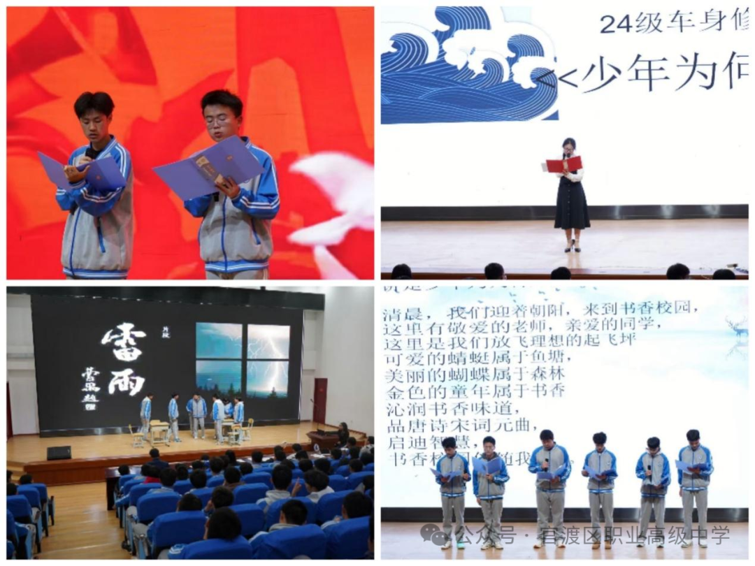 活动以班级为单位,通过朗诵、情景剧、多媒体互动等形式,分享阅读感悟。24级车身修复班以鲁迅《狂人日记》的犀利剖析与《少年为何读书》的激情叩问开场,引发对“读书与觉醒”的深刻思考;24级汽运1班则以高尔基《童年》的温情叙事,结合《穿梭岁月的言语》中跨越代际的对话,诠释了阅读对心灵的治愈力量。