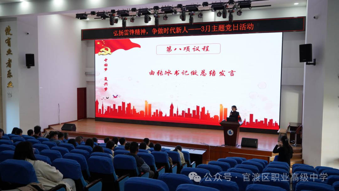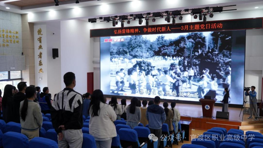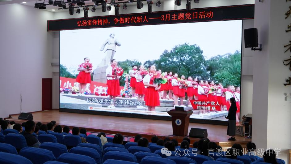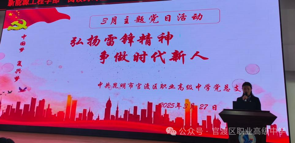 为深入贯彻习近平新时代中国特色社会主义思想,进一步加强党员党性修养,弘扬雷锋精神, 2025 年 3 月 27日,中共昆明市官渡区职业高级中学党总支开展了以“弘扬雷锋精神,争做时代新人”为主题的党日活动。活动由刘宝倩同志主持,全体党员参与。