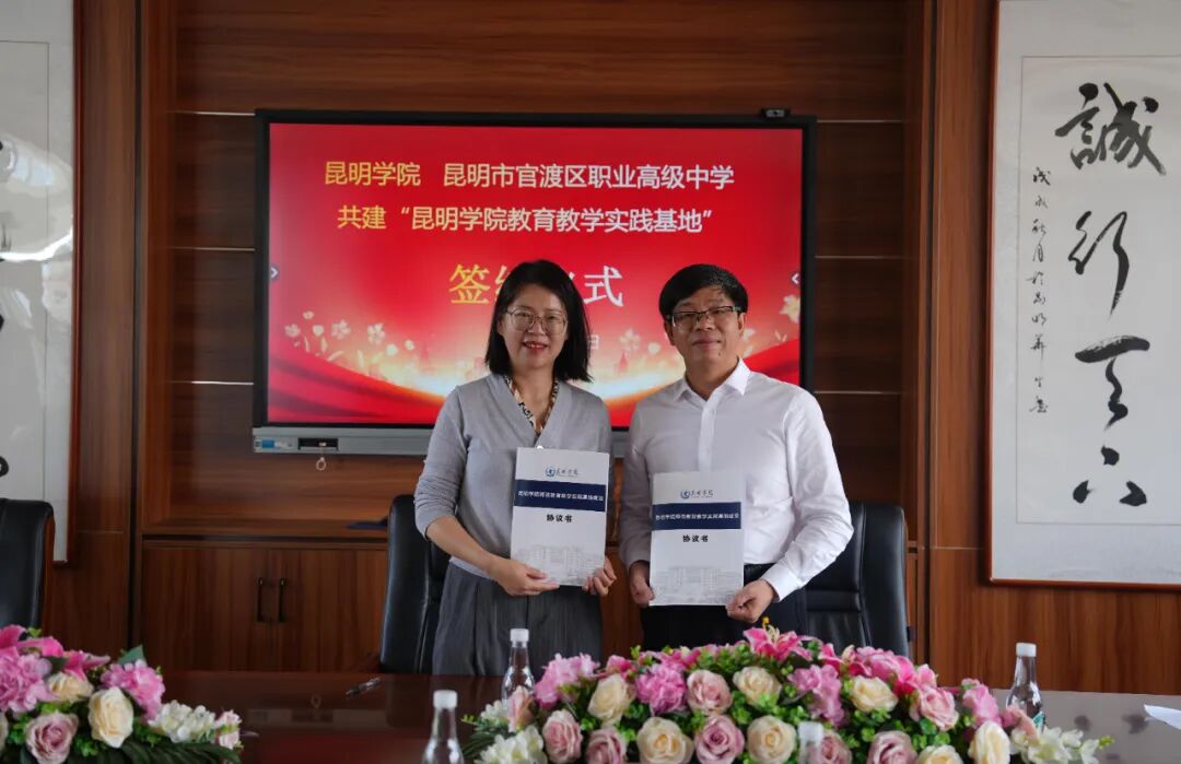 会议最后,昆明学院李剀副校长和昆明市官渡区职业高级中学杨燕校长相互签署共建“昆明学院教育教学实践基地”协议书,并由李剀副校长代表昆明学院向昆明市官渡区职业高级中学授牌。