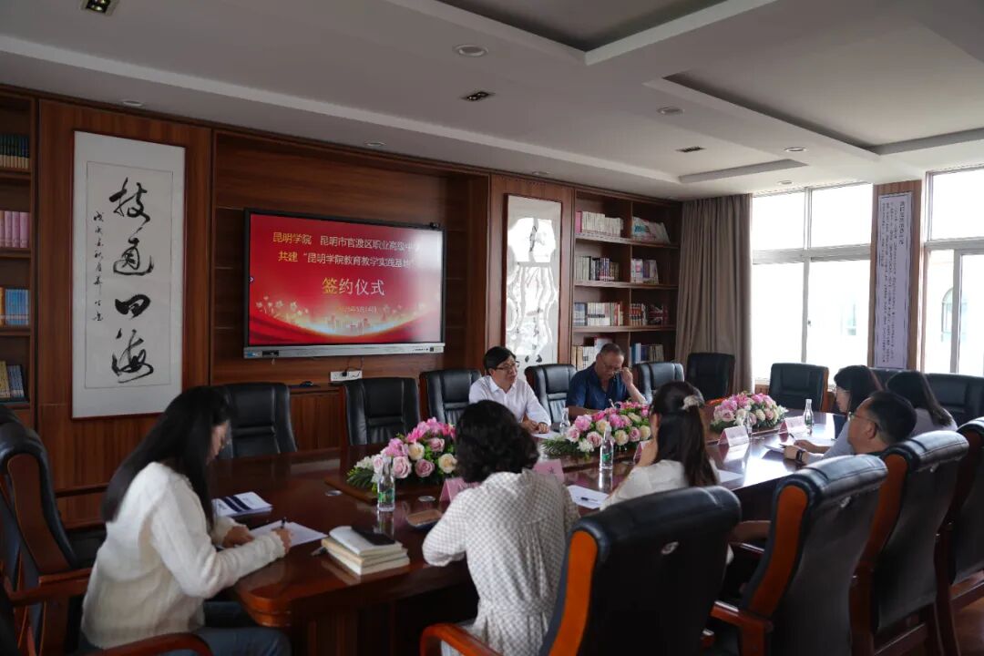 为贯彻落实国家“建设高质量教育体系”的总体目标和要求,深入推进校校、校政、校企合作育人机制,5月14日下午,昆明学院 昆明市官渡区职业高级中学共建“昆明学院教育教学实践基地”签约仪式在我校举行。昆明学院党委委员、副校长李剀,昆明学院对外合作交流处国内合作交流科科长赵春阳,昆明市官渡区职业高级中学张毕祥总校长、杨燕校长、张冰书记、徐梅芳校长助理、李娟校长助理出席会议。
