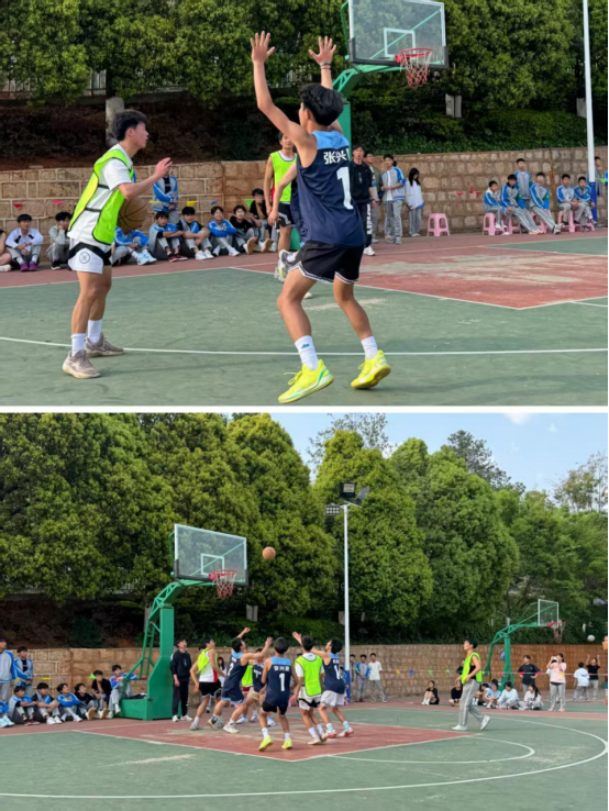 作为本届体育节的“重头戏”,篮球赛采用循环赛与淘汰赛结合的赛制,每个学部选派1支队伍参赛。赛场上,选手们凭借精准投篮、灵活突破和默契配合点燃观众热情,多场比赛比分胶着至最后一刻。教师裁判团队全程执裁,通过赛前培训与实战演练,确保了赛事公平公正。赛事不仅提升了学生的战术素养,更培养了尊重规则、永不言弃的体育精神。