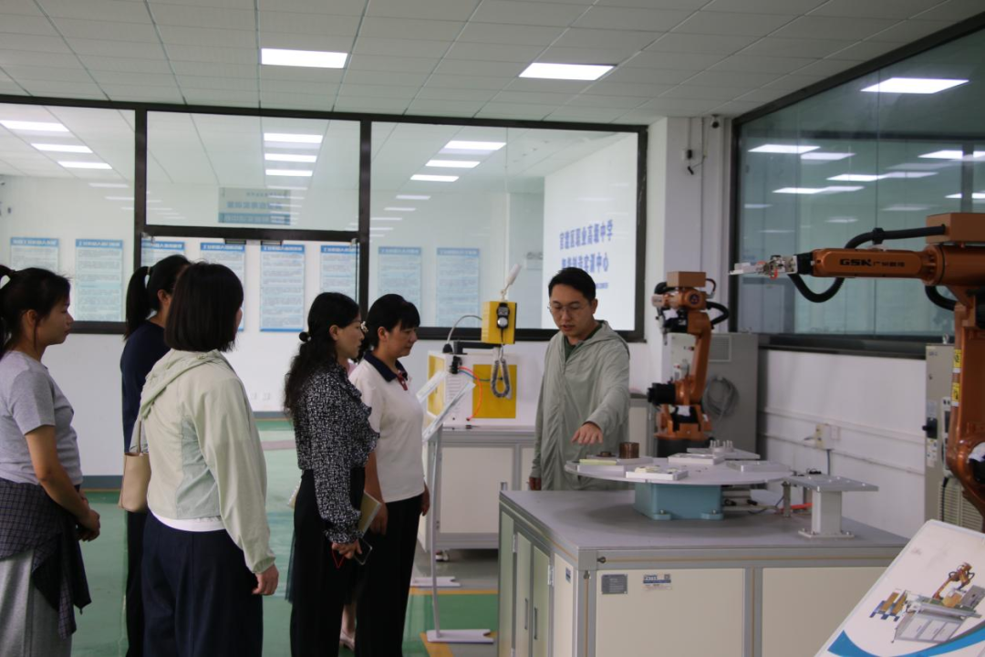 在杨秋副校长的引导下,来访团队首先参观新能源汽车产教融合基地。来访团队观摩了校企共建的智能化实训场景,了解新能源汽车产业链人才培养模式。基地以“教学-实训-产业”一体化模式为核心,配备先进设备及真实生产环境,展现了校企协同育人的显著成效。在新媒体中心,学生团队现场展示了自主制作的校园文化宣传视频,来访教师对学生作品创意性与专业性给予高度评价。