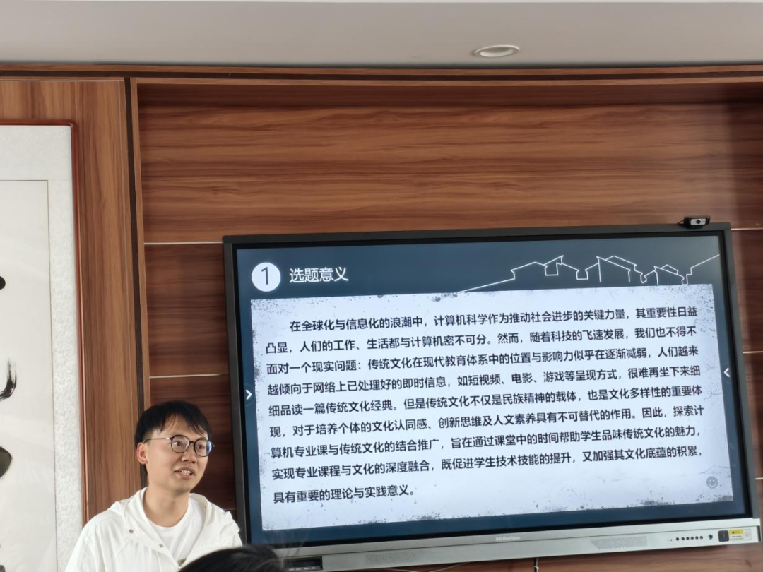 接着由王龙老师汇报《中职计算机专业课与优秀传统文化的结合推广》课题,旨在帮助学生品味传统文化的魅力,实现专业课程与传统文化的深度融合。课题组计划通过古文诗词、传统节日、文化价值观等融入到专业课程中形成教学模式。