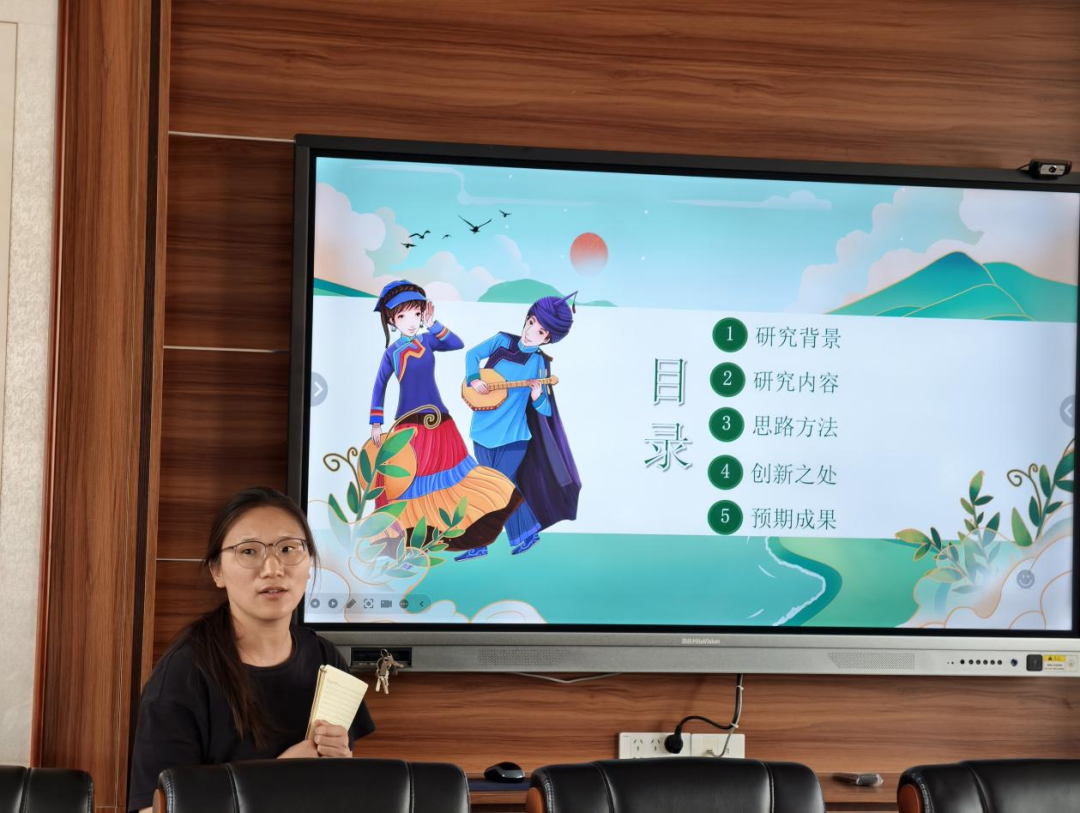 首先由付珍珍老师汇报《阿拉街道撒梅传统文化节日在官职电子商务专业教学中的应用研究》课题,旨在破解民族文化传承与专业技能培养脱节问题。课题组计划通过传统节日文化符号,开发"非遗+电商"实训手册,构建跨动漫、数媒、电商三专业的协同教学机制,最终形成可推广的本土化教学模式。