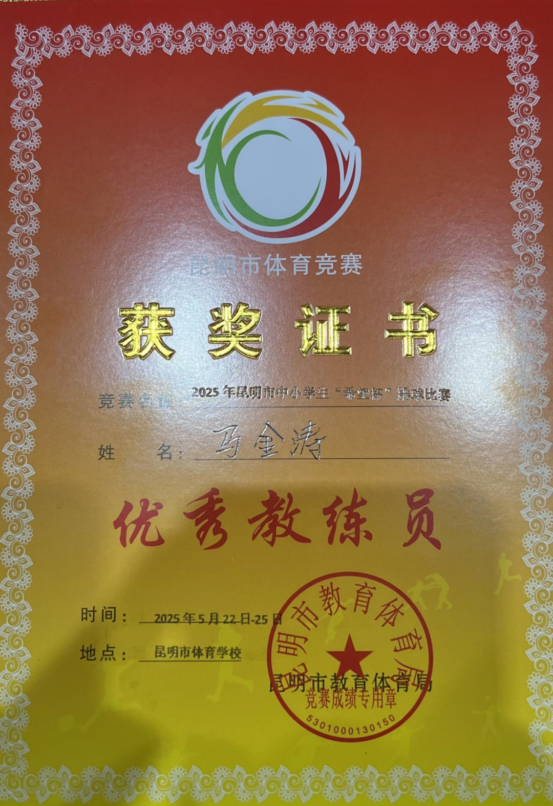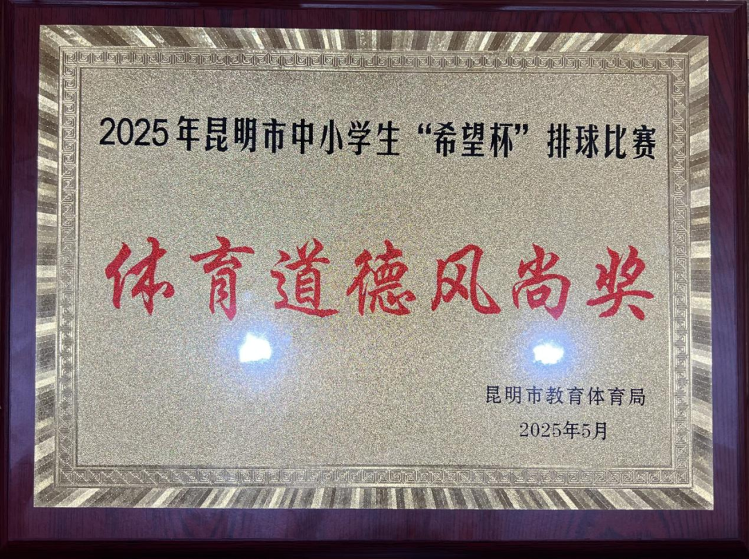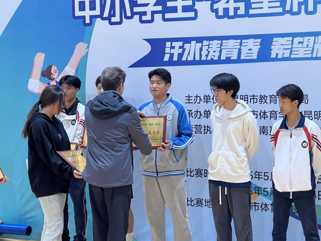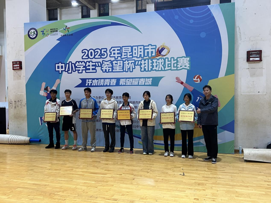 学生发展中心讯:在绿意盎然的初夏时节,昆明市各中小学的运动健儿们齐聚一堂,共同见证2025年“希望杯”排球赛事的精彩对决。经过激烈角逐,我校排球队以顽强拼搏的体育精神,获得“体育道德风尚奖”,马金涛老师被授予“优秀教练员”荣誉称号,为我校体育教育再添光彩!