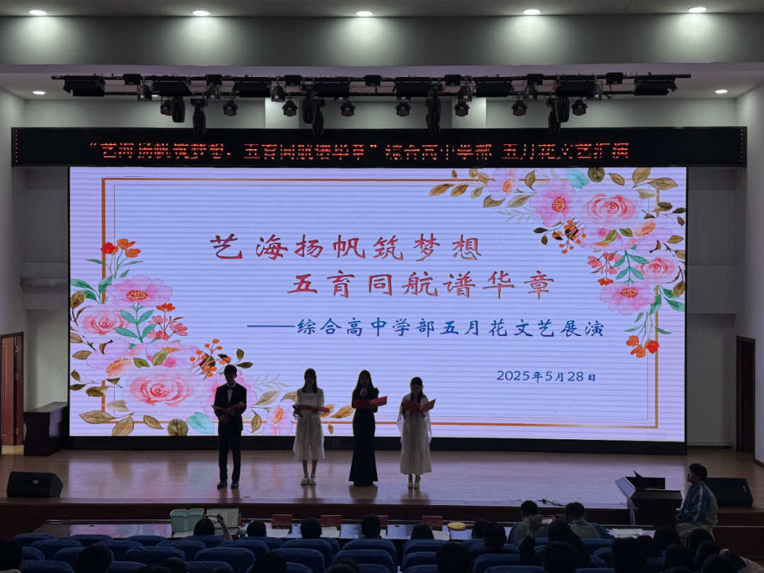 五月的校园,花香与艺术交融,青春与梦想齐飞。5月28日星期三下午,综合高中学部在任之厅隆重举办了“艺海扬帆筑梦想,五育同航谱华章”五月花艺术节文艺展演活动。全体师生齐聚一堂,用歌声、舞蹈和创意诠释青春的活力,共同见证了一场精彩纷呈的艺术盛宴。