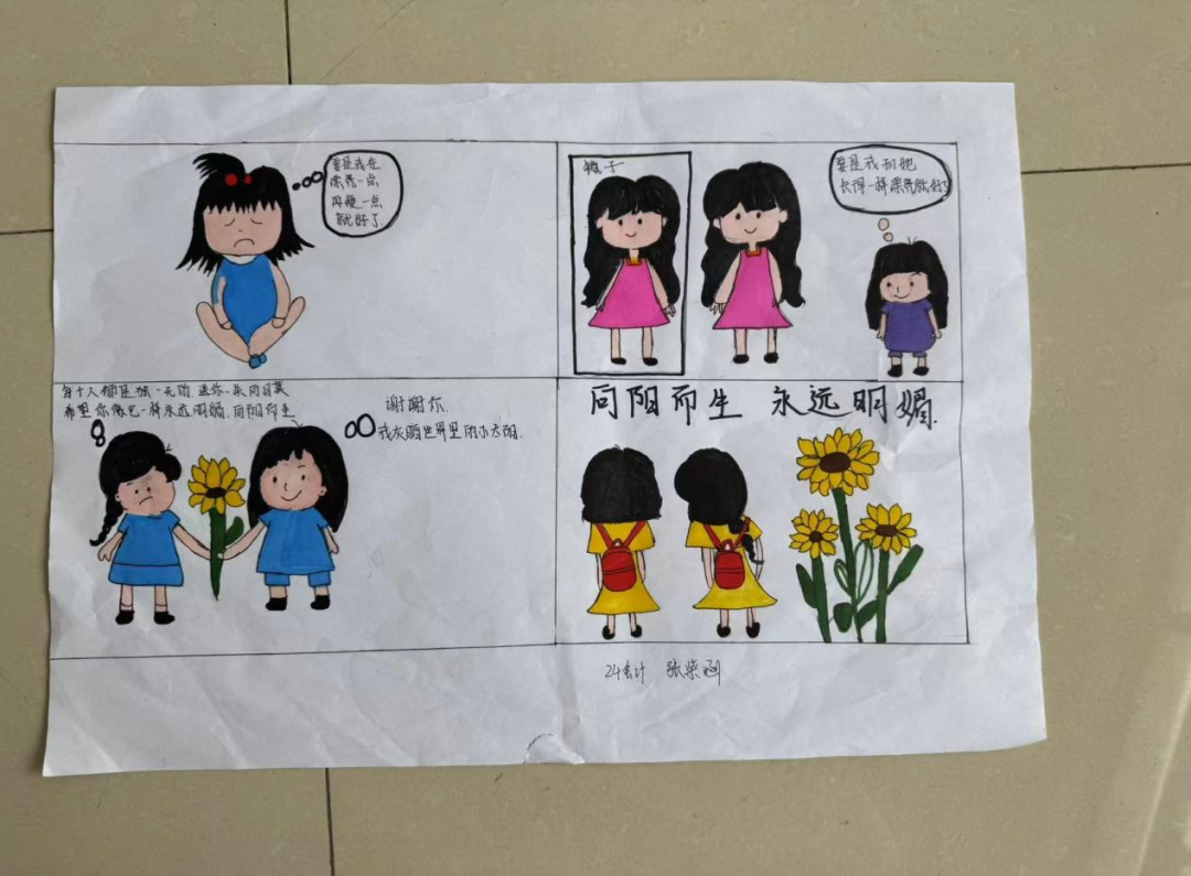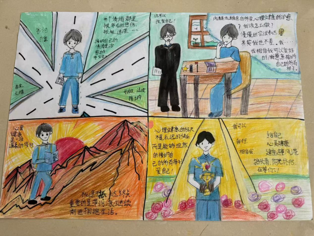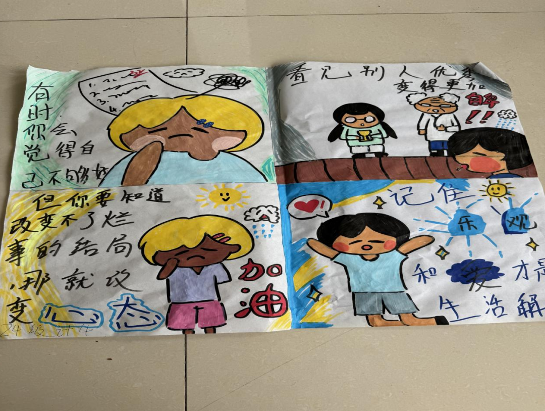 各班利用班会课组织创作,围绕积极心理主题,用四格漫画展现内心冲突、解决过程或成长感悟。活动以趣味方式引导探索心灵世界,在创作与分享中构建积极心理支持网络,实现“绘画心育”的育人效果。