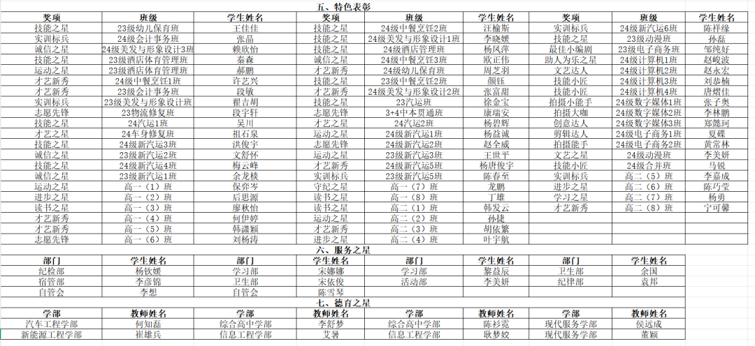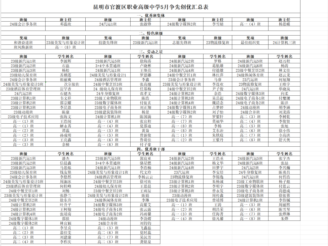 学生发展中心讯:五月份以来,德育工作稳步开展、活动丰富多彩,按照班级自荐、学部推荐、学生发展中心审查的程序,涌现了一批先进个人和先进集体。鉴于此,2025年6月16日上午,官渡区职业高级中学特举行“奋进逐光,卓越领航”——五月争先创优表彰活动。