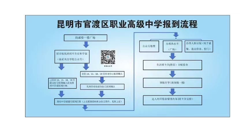 6.新生采用“线上缴费”,费用包含:住宿费、教材费等,所有费用预计1500元左右。请提前关注“昆明市官渡区职业高级中学”微信公众号,到校后进行线上缴费。