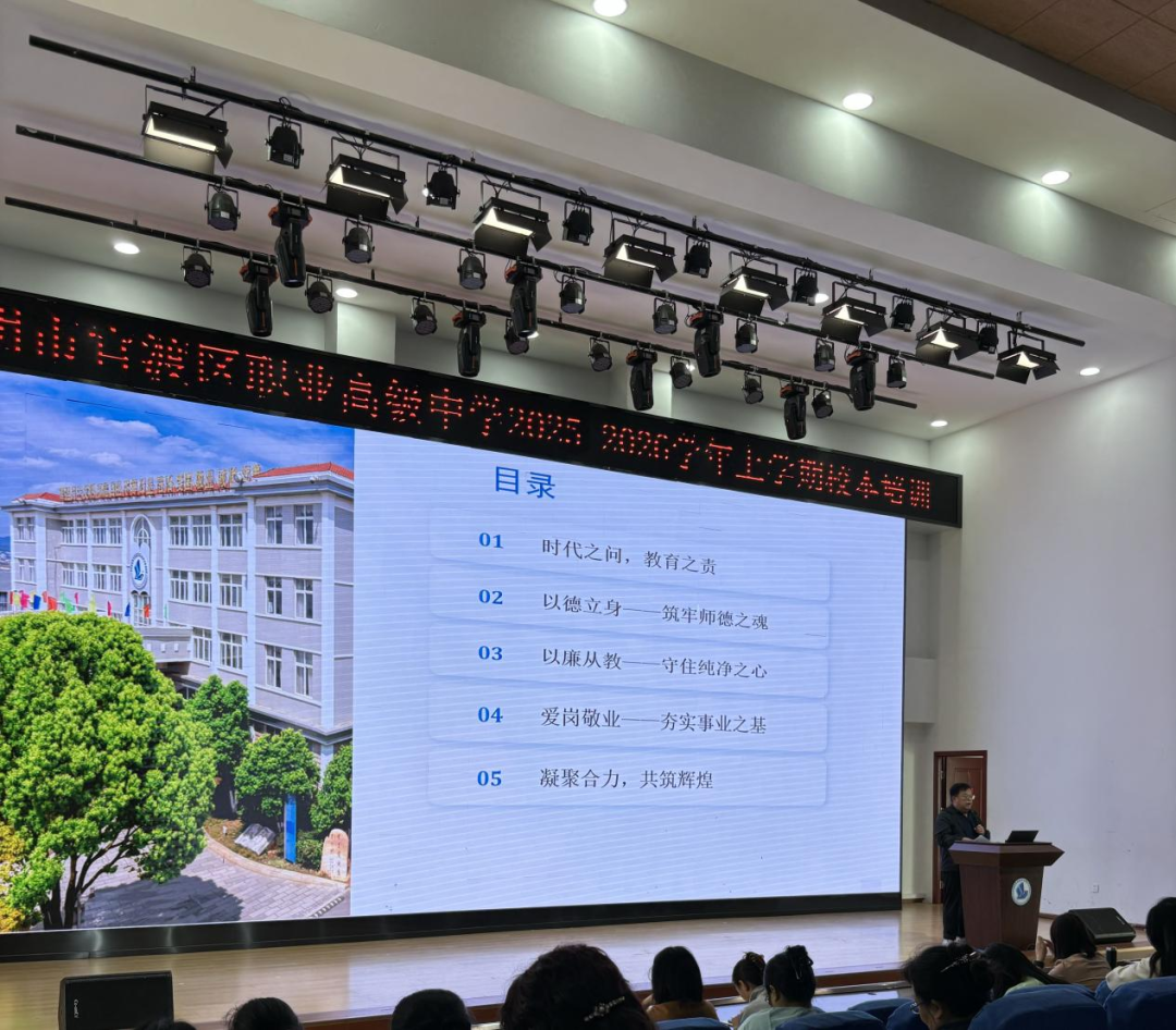 张毕祥总校长为全体教师作了题为“德廉并重,爱岗为基,共筑教育新征程”的师德师风建设专题报告。张校长首先提出“时代之问,教育之责”,深刻阐述了新时代教育工作者的使命与担当。随后,他强调“以德立身,筑牢师德之魂”,要求全体教师坚守教育初心,以身作则,为人师表;同时指出“以廉从教,守住纯洁之心”,警示大家要廉洁自律,规范从教行为;最后,张校长号召全体教师“爱岗敬业,夯实事业之基”,将爱心与责任融入日常教育教学的点点滴滴。报告高屋建瓴,语重心长,为我校教师队伍的师德建设指明了方向。