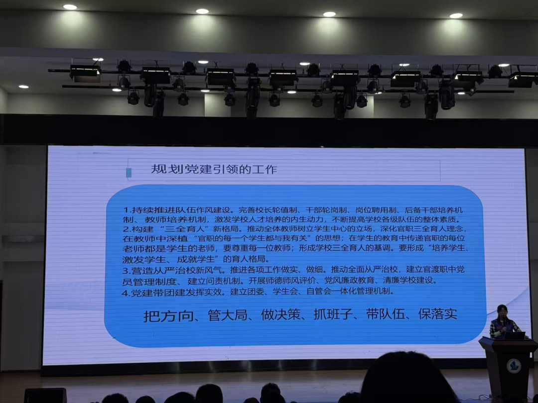 最后,由张冰书记对学校的发展及未来做了总结与规划。张冰书记指出:目前官职内涵建设处于高质量发展关键期,党建工作取得较大成效、学校发展取得突破性的成绩。在未来的发展中,继续推进队伍作风建设,构建“三全育人”的新格局,营造从严治校新风气,党建带团建发挥实效,同时全体党员要发挥先锋模范作用,在学校高质量发展进程中发挥自身能量、体现自身价值。