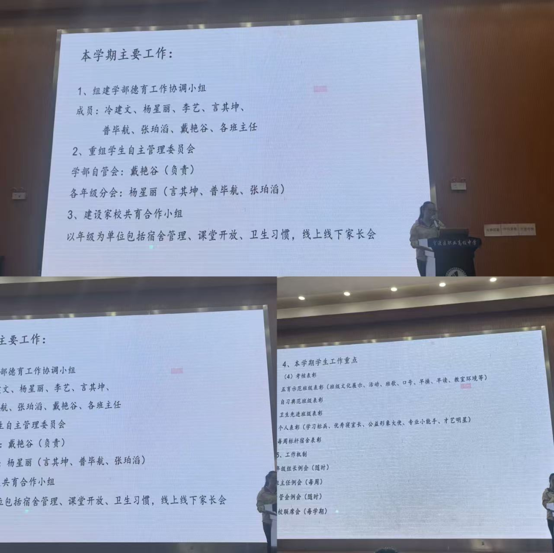 德育工作上,德育干事杨星丽老师统筹安排学部德育工作,指出本学期学部德育的主要工作。即组建学部德育工作协调小组,成员涵盖冷建文部长、各年级组长及各班主任;重组学生自主管理委员会,由戴艳谷老师负责学部自管会;建设家校共育合作小组,以年级为单位,开展宿舍管理、课堂开放等工作,举办线上线下家长会。同时,明确本学期学生工作重点,包括对五育示范班级、自习典范班级等进行考核表彰,以及个人表彰和每周标杆宿舍表彰;建立年级组长例会、班主任例会等工作机制。