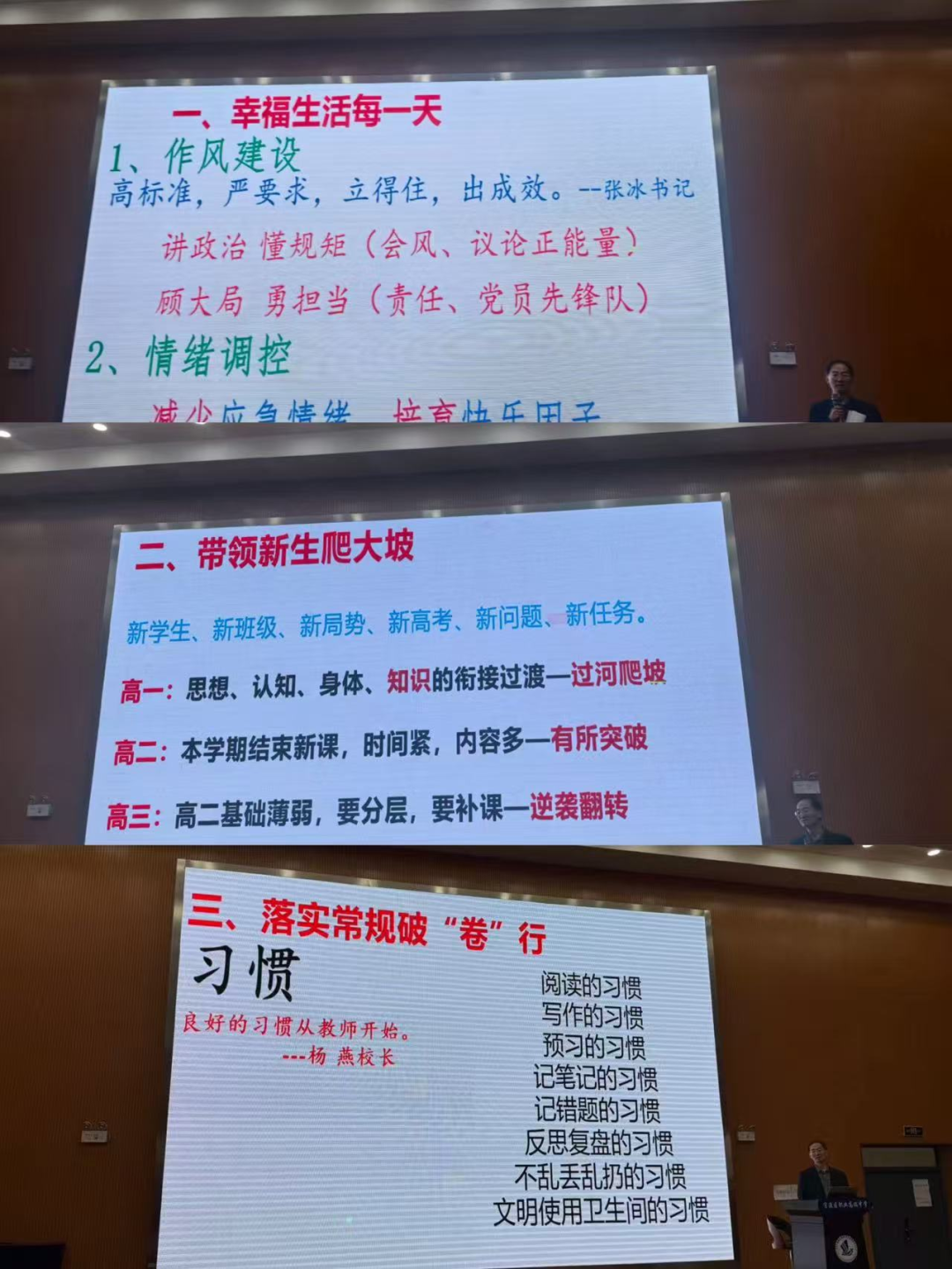 最后,由冷建文部长进行总结发言,冷部长围绕“幸福生活每一天”“带领新生爬大坡”“落实常规破‘卷’行”等主题展开。在“幸福生活每一天”板块,强调作风建设要高标准、严要求,讲政治、顾大局;关注情绪调控,减少应急情绪,培育快乐因子,倡导以学习抵御烦恼。同时,结合相关教育政策,展望学校未来发展,让教职工对学校前景充满信心。针对不同年级学生特点,提出“带领新生爬大坡”的工作思路。高一注重学生思想、认知、身体和知识的衔接过渡;高二面临新课结束、时间紧的情况,要力求有所突破;高三针对基础薄弱问题,通过分层教学、补课等方式,助力学生逆袭翻转。在“落实常规破‘卷’行”方面,强调培养学生阅读、写作、预习等良好习惯,且良好习惯要从教师自身做起。教学上,秉持以学生发展为中心的理念,将育人与教育理念相融合,既直面现实提升学生高考成绩、让其掌握初级技能,又兼顾未来培养发展能力,还可借助景点推介、特色食品介绍等形式丰富教学。此外,倡导“大德育观”,人人都是班主任,要以陪伴的姿态开展教育,用身边故事激发学生期待与学习动力;重视分层教学,依据不同年级特点因材施教;落实常规,培养学生多方面良好习惯。安全工作也被重点提及,要防范扶栏而站、追逐打闹等各类安全隐患,同时注重培养学生自我保护、岗位胜任及职业跨界等能力。
