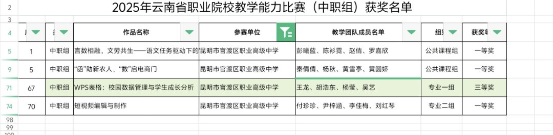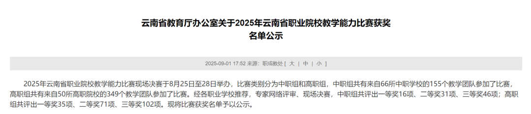 我校教师在 2025 年云南省职业院校教学能力比赛中斩获佳绩我校教师在 2025 年云南省职业院校教学能力比赛中斩获佳绩捷报传来,振奋人心!2025 年云南省职业院校教学能力比赛(中职组)赛场激烈角逐落下帷幕,我校参赛教师团队凭借扎实过硬的教学功底、独具巧思的创新设计与从容出彩的现场展示,在全省众多参赛队伍中一路披荆斩棘、突破重围,最终强势斩获 3 个一等奖与 1 个三等奖!(荣获一等奖最多的中职学校)这份亮眼战绩,不仅是对教师团队日夜打磨、精益求精的最好肯定,更充分彰显了我校在中职教育领域的教学硬实力,为学校赢得了荣誉,也为全校师生注入了强劲动力!在此,向所有获奖教师致以最热烈的祝贺!来源|教师发展中心作者|教师发展中心/文字 教师发展中心/图片 排版|李世仙责编|李世仙审核|张婷婷1END