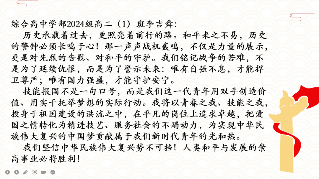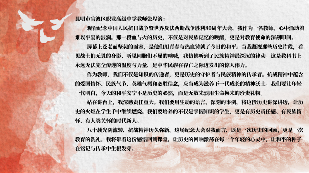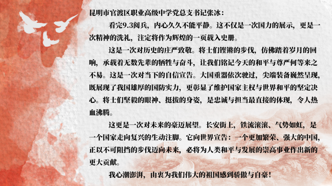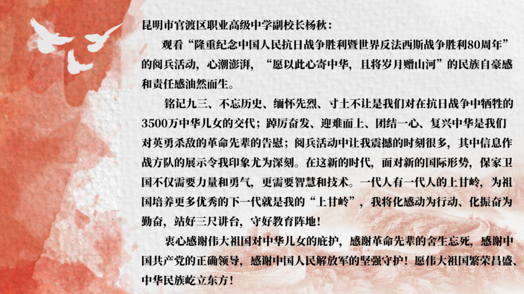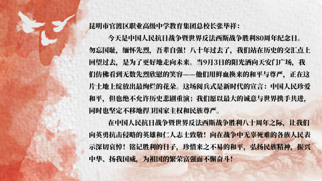 此次集中观看活动,是一堂震撼心灵的爱国主义教育课,不仅是对那段波澜壮阔历史的深情回望,更是向为民族独立与人类和平英勇献身的革命先烈致以最崇高的敬意,进一步增强了全校师生的民族自豪感、历史使命感和时代责任感。学校将持续以“立德树人”为根本任务,引导新时代青少年从伟大爱国主义精神和伟大抗战精神中汲取奋进力量,铭记“正义必胜、和平必胜、人民必胜”的伟大真理,厚植家国情怀,坚定理想信念,勇担时代使命。让红色基因在传承中焕发时代光芒,激励广大师生以更加昂扬的姿态奋进新征程、建功新时代,为实现中华民族伟大复兴的中国梦不懈奋斗。