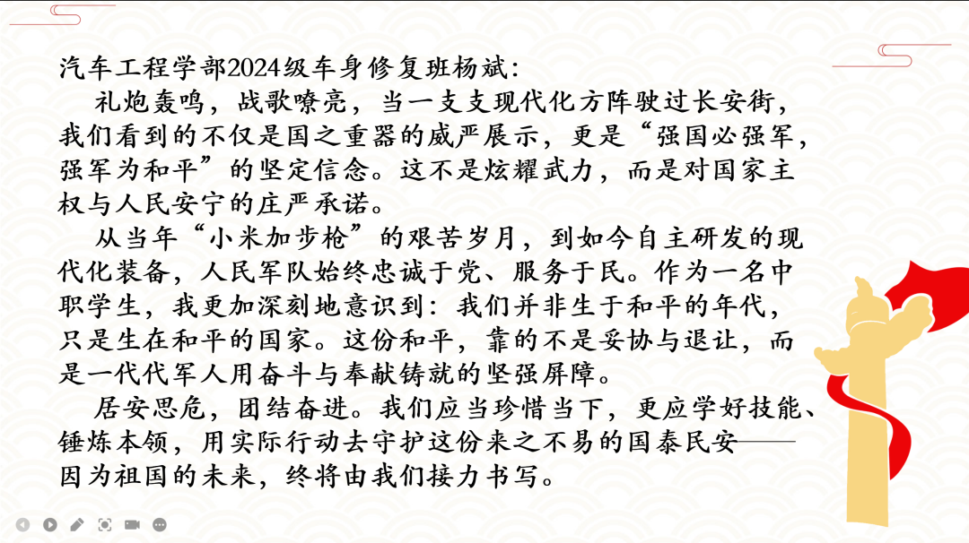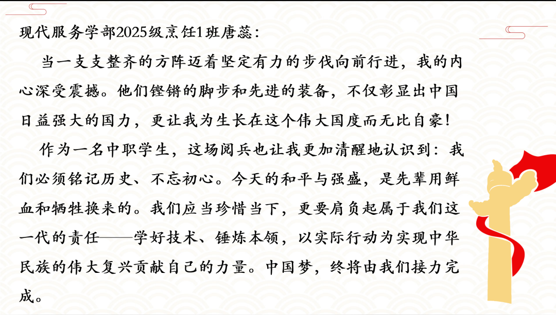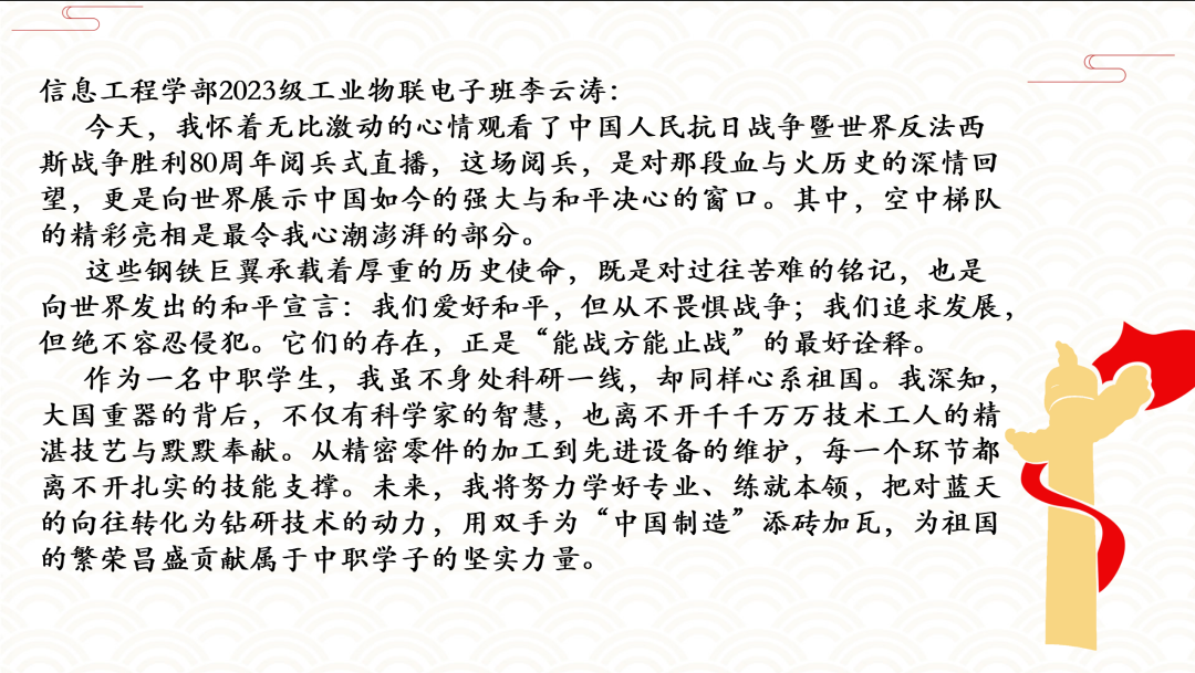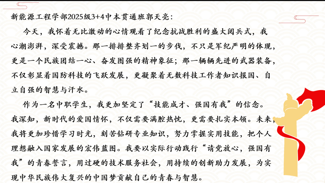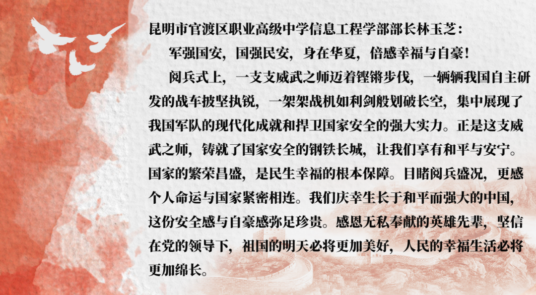 阅兵仪式上,护旗梯队气势如虹,高扬的旗帜象征着光辉的征程;徒步方队步伐坚定、英姿飒爽,彰显人民军队听党指挥、忠诚可靠的信念;战旗方队庄严肃穆,一面面英雄战旗迎风飘扬,承载着革命先烈的不朽功勋与伟大精神;装备方队铁流滚滚、气势磅礴,新型武器装备集中亮相,尽显国防科技现代化的强劲步伐;空中梯队振翅长空、呼啸而至,战机编队掠过天安门上空,划出壮美航迹。师生们凝神观看,被一幕幕震撼人心的场景深深打动,为人民军队的威武雄壮和祖国的繁荣富强感到由衷自豪,不禁心潮澎湃、热泪盈眶。