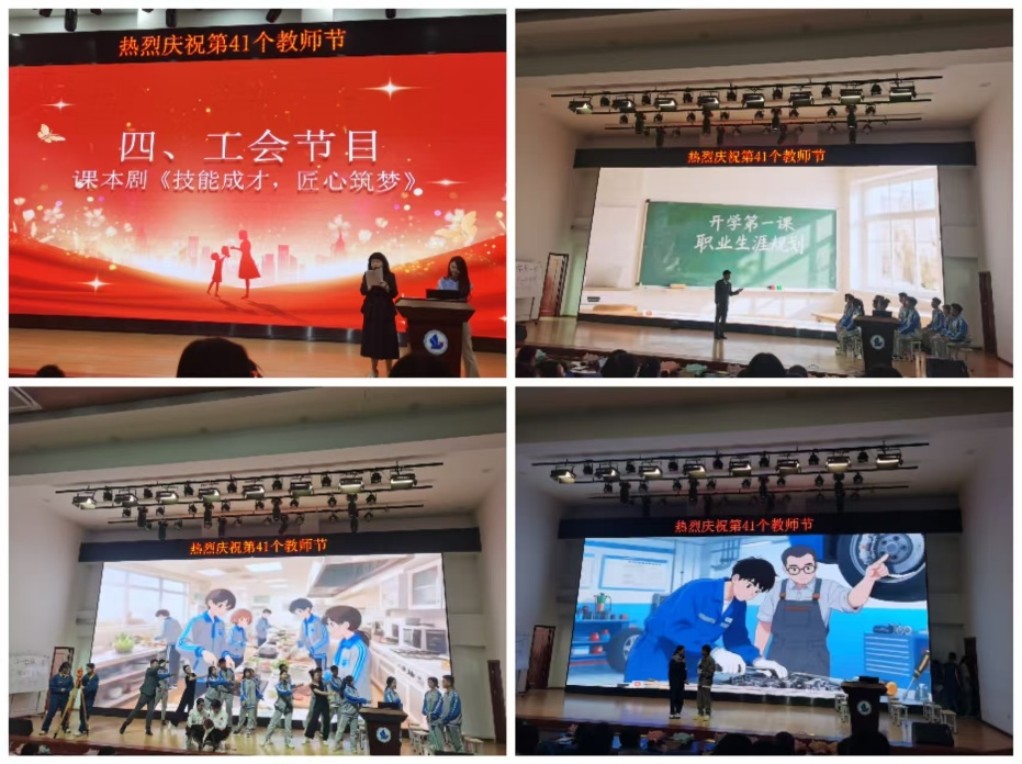 活动伊始,全体人员共同观看学校荣誉视频,回顾过去一学年学校在各级各类比赛中斩获的骄人成绩,以及老师们在教育教学中的精彩瞬间,每一份荣誉都凝聚着师生的智慧与汗水,彰显“立德树人”初心。随后,24 级酒店管理班学生带来歌曲《如愿》,用清澈温暖的歌声传递对前辈奉献的感恩与对未来的期许;师生共同演绎课本剧《技能成才匠心筑梦》,生动展现学校育人理念,赢得现场阵阵掌声。