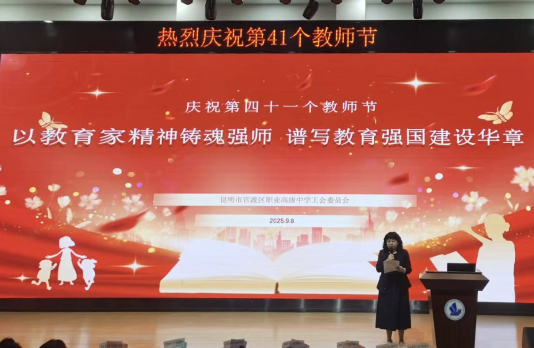 金秋九月,丹桂飘香。在第41个教师节来临之际,昆明市官渡区职业高级中学于9月8日下午举办庆祝活动,大家欢聚一堂,共同庆祝属于自己的节日。首先,工会主席郭丽霞老师代表学校向辛勤耕耘在教学、管理、服务一线的全体教职工致以诚挚的问候与崇高的敬意,向大家送上节日祝福。