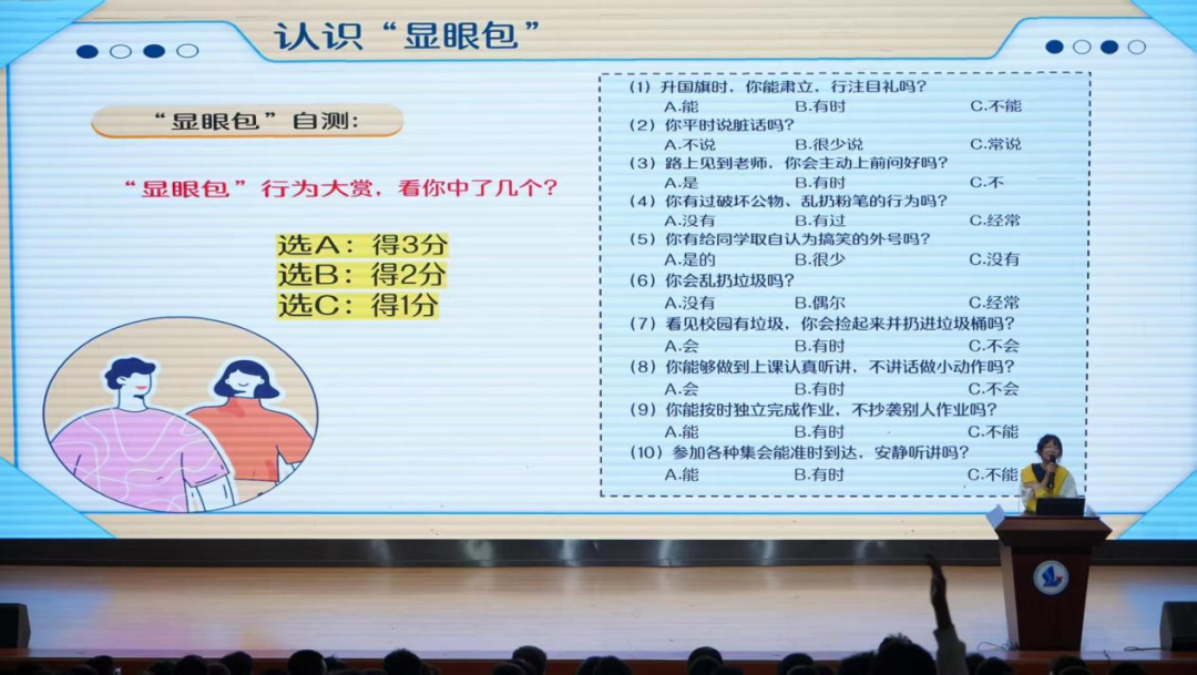 针对当下网络流行语“显眼包”所代表的一些博取眼球但欠妥的行为,陈老师进行了巧妙引申和说明。她通过贴近学生生活的实例,引导大家辨析什么是真正的“出彩”,什么是失范的“出格”,告诫同学们要知荣明耻,自觉规避不文明行为,追求内在修养而非浮夸表现。