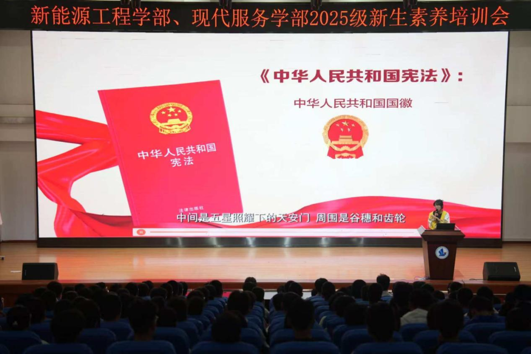 讲座开始,陈老师首先为同学们深入解读了中华人民共和国国旗法、国歌法、国徽法,阐述了国家象征的神圣与尊严,强调尊重和维护国旗、国歌、国徽是每一位公民应尽的义务。紧接着,她详细讲解了《校园"十项严禁"》《德育学分管理规定》及《学生仪容仪表要求》等校级规章制度,将爱国主义教育与学生日常行为规范紧密结合,帮助新生在筑牢信仰之基的同时,明晰行为红线,强化纪律意识与责任担当。