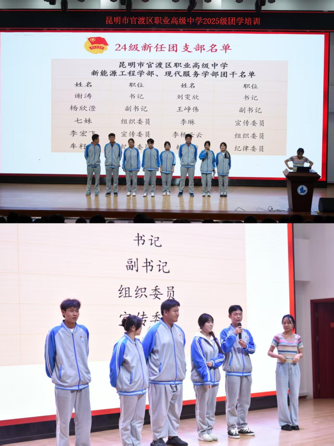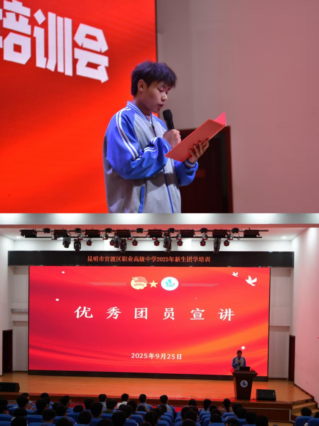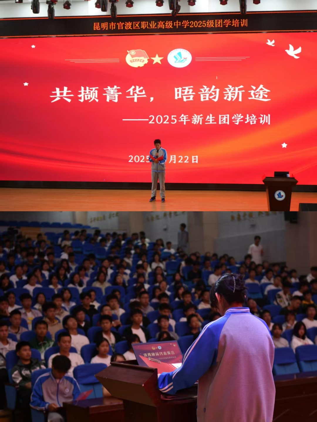 学生发展中心讯:秋阳杲杲,金风送爽。为引领2025级新生深入了解共青团的光辉历程与时代使命,筑牢理想信念根基,激发青年学子奋发有为的内生动力,昆明市官渡区职业高级中学于9月22日至25日成功举办了为期四天的2025级新生团学知识系列培训。本次培训在校团委书记陈晓艺老师的总体指导下,创新采用“校团委统筹、学部主导、学生自主、朋辈引领”的模式,由各学部团总支学生干部自主主持,并邀请优秀团员代表分享成长经验,取得了显著成效。