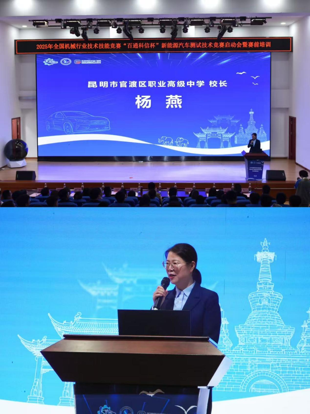 杨燕校长深情回顾学校发展历程,言及从区级职校到国家级示范的蜕变,每一步皆凝聚智慧与汗水。她强调,此次竞赛乃学校办学能力之试金石,亦是推动产教深度融合、共育英才之良机。官渡职中将全力以赴,确保赛事圆满,为新能源汽车行业输送栋梁之才。