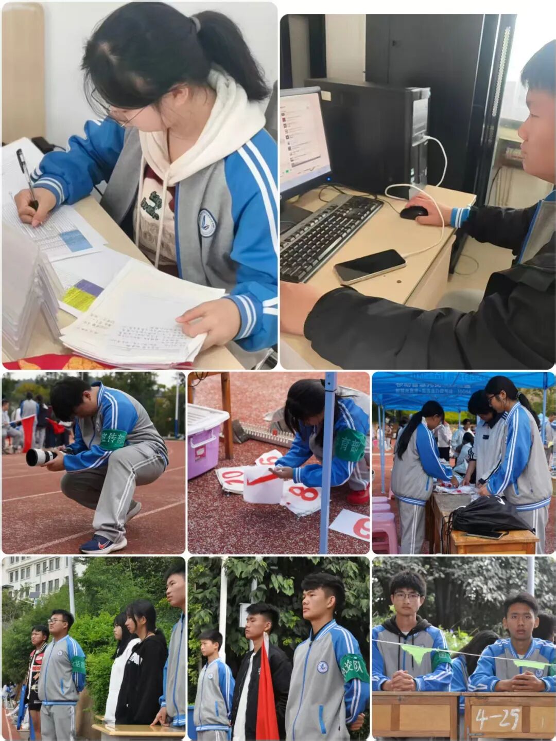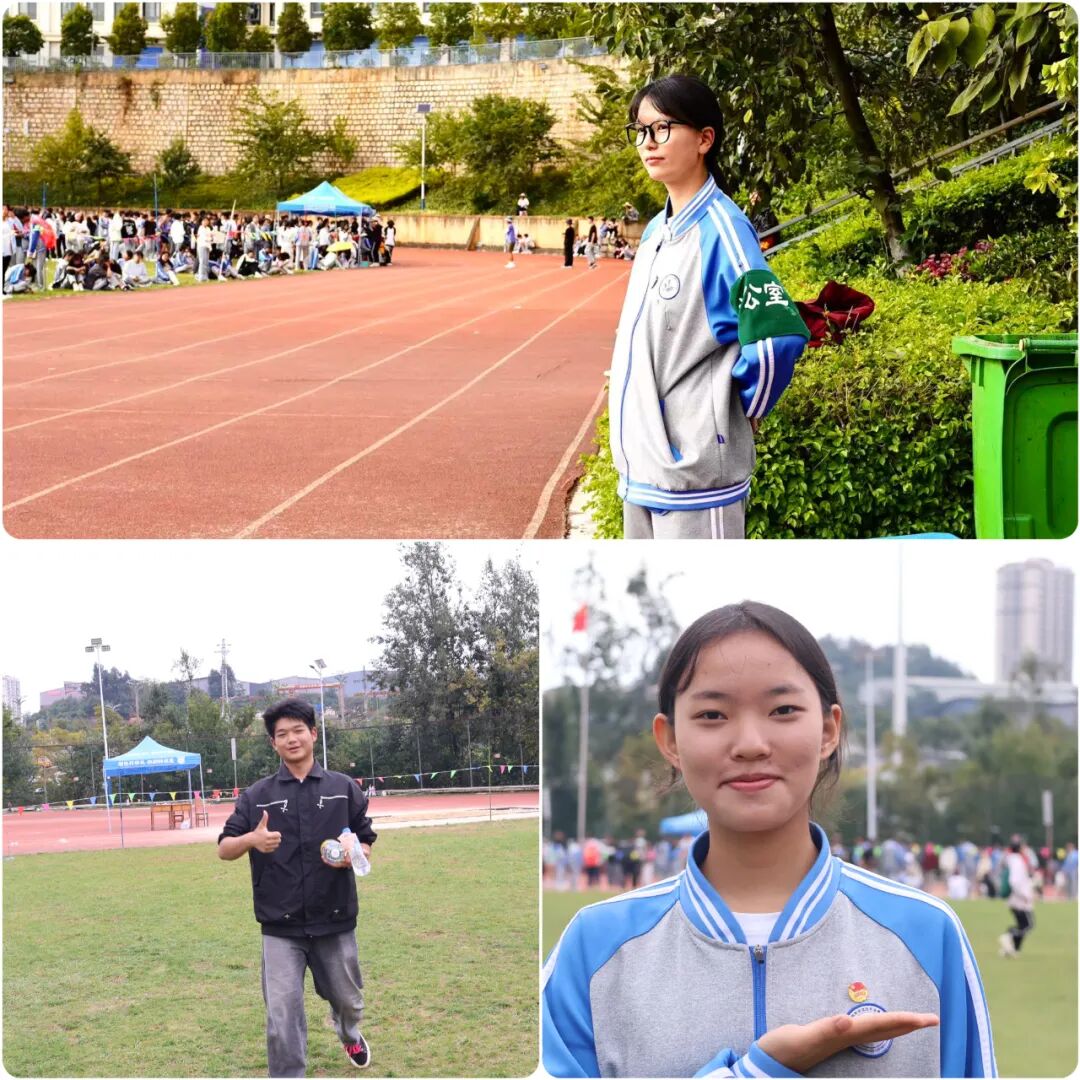 比赛期间,志愿者们分工明确、协作高效:赛场周边的“安全卫士”时刻紧盯现场动态,一旦发现有观众探出护栏、试图靠近比赛跑道等情况,会立即温和上前劝阻,同时协助维持检录处秩序,确保运动员按时、有序参与比赛;广播台旁的志愿者则快速整理各班提交的加油稿,通过洪亮清晰的播报为运动员传递鼓励,让阵阵助威声回荡赛场,为竞技氛围注入满满动力;遇到运动员跑完长跑后体力不支,或不慎擦伤,志愿者们会第一时间递上矿泉水、纸巾,协助老师将其护送至休息区,用细致关怀为赛场增添暖意。