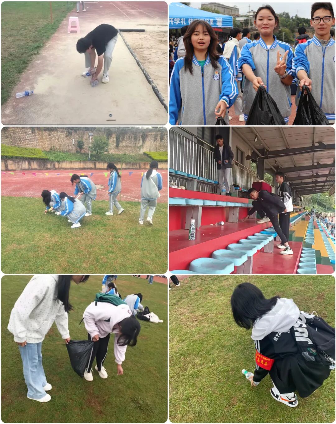 每日运动会结束后,当运动员与观众陆续离场,志愿者们又迅速切换至“保洁模式”。他们手持垃圾袋,沿着草坪边缘、观众席通道、空地角落仔细排查,弯腰捡拾散落的纸屑、塑料瓶、零食包装袋,甚至蹲下身清理嵌在草皮里的小垃圾。经过近一小时的集中清理,原本留有赛事痕迹的场地恢复整洁,翠绿的草皮、干净的空地,为次日赛事营造了清爽舒适的环境。连续三天,无论烈日当空还是微风拂面,志愿者们始终热情饱满,坚守岗位、互帮互助,没有一人叫苦、没有一人中途退缩。