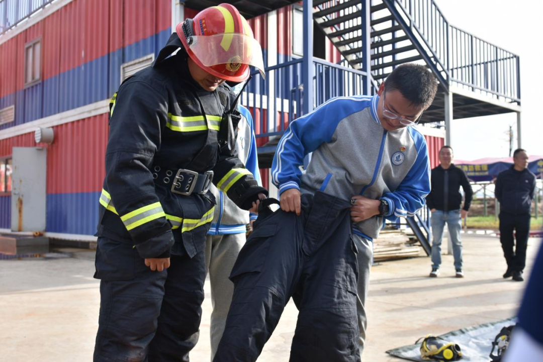 装备展示区瞬间变成了最热门的“打卡点”。在消防员的鼓励和帮助下,团员青年们争先恐后地试穿消防服。“这衣服比看起来重多了!”刚穿上消防外套的同学气喘吁吁地说。厚重的装备让原本轻松的氛围多了几分凝重,大家在这份“生命之重”中,读懂了消防员逆行时的那份担当。